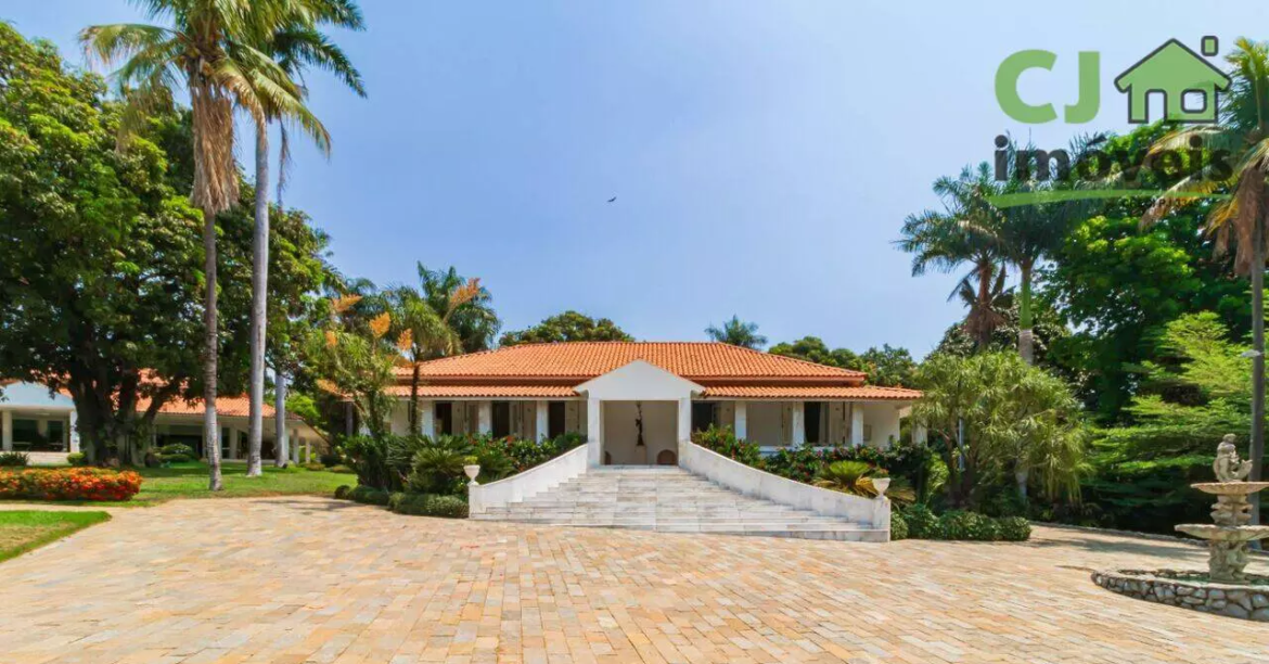 A casa principal, em estilo clássico, reúne 6 quartos (5 suítes), salas integradas em 4 ambientes, cozinha espaçosa e uma ampla varanda em mármore com vista panorâmica.